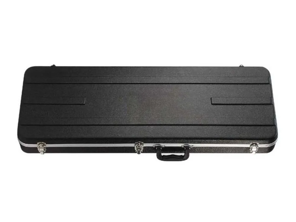 Čtyřhranný základní (lehký) kufr pro elektrickou kytaru z černého plastu ABS, hliníkový obvodový profil, vnitřek černý plyš, schránka na příslušenství, chromové zámky, pevné ucho.