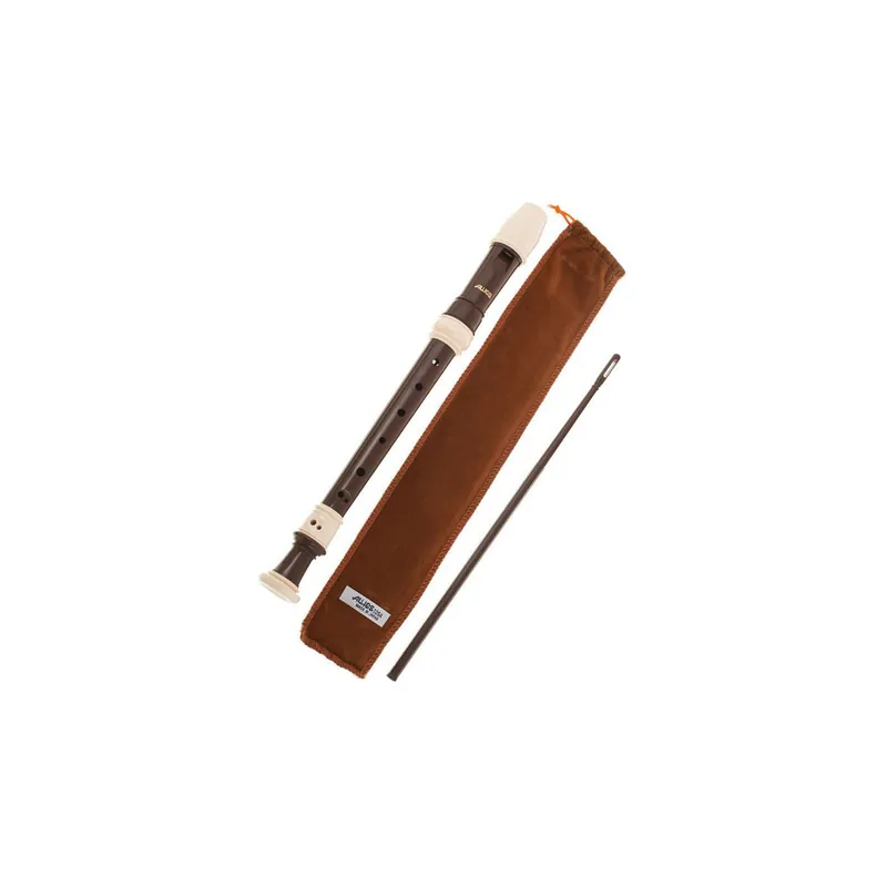 Sopránová zobcová flétna hnědé barvy. Nástroj je umělohmotný dodávaný s textilním povlakem.