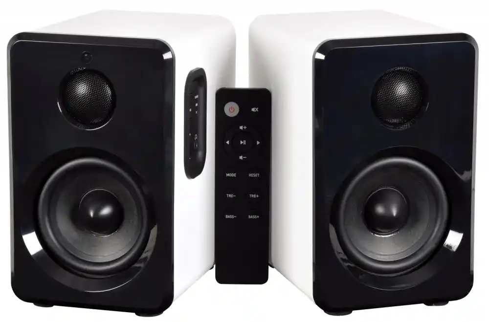 Aktivní sada malých kompaktních reproduktorů. Atraktivní a moderní design, kvalitní zvuk s dostatečným výkonem. Zabudovaný Bluetooth přijímač pro přehrávání hudby z mobilních zařízení, USB port a Micro SD slot pro přehrávání z paměťových médií. Linkový vstup AUX (Jack 3,5 mm) pro připojení externího přehrávače, televizoru, počítače nebo notebooku. Volba režimu přehrávání a regulace hlasitosti na bočním ovládacím panelu reproduktoru. Možnost pohodlného ovládání pomocí přiloženého dálkového IR ovladače. Výkon 2x 15W (8 Ohm), systém je osazen 3,5″ basovými a 1″ výškovými reproduktory, barevné provedení saténová bílá.