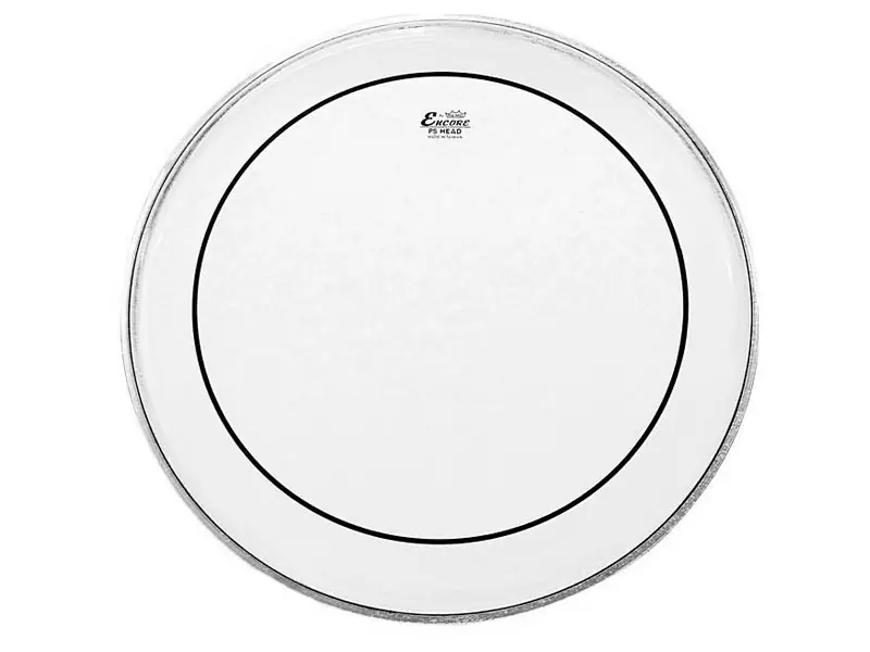 Pinstripe Clear Bass 20″. Dvojitá (2x 0,007″) plastová, čirá folie, spojená u límce. Tím dochází k utlumení vyšších frekvencí a rezonance u okrajů. Ideální v nižších polohách ladění.