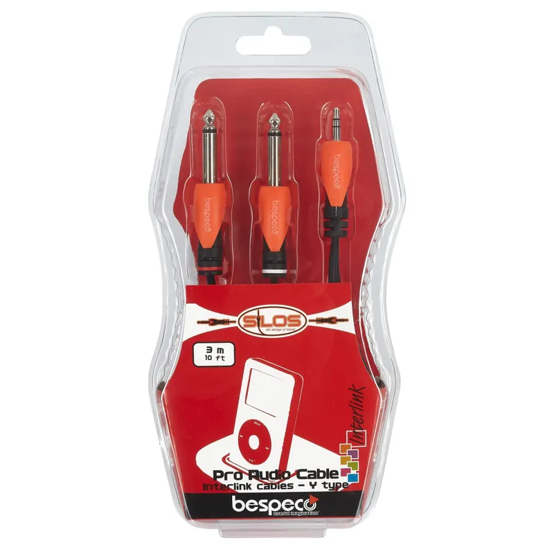Propojovací kabel s profilovaným stereo jackem 3,5 mm, dva profilované mono jacky 6,3 mm. Tento kabel ze série Bespeco Silos disponuje vodičem z 98% bezkyslíkaté mědi (OFC) a vnitřním polovodivým PVC pláštěm, díky němuž neprodukuje žádný šum. Ke kvalitě zvuku přispívá i spirálové stínění na více jak 92 procentech vodiče nebo lité plastové konektory. Samozřejmostí je odolné a zároveň flexibilní opláštění z PVC a vulkanizovaného silikonu. Kabely z této série se hodí k celé řadě aplikací a překvapí výbornou kvalitou a velice příjemnou cenou.