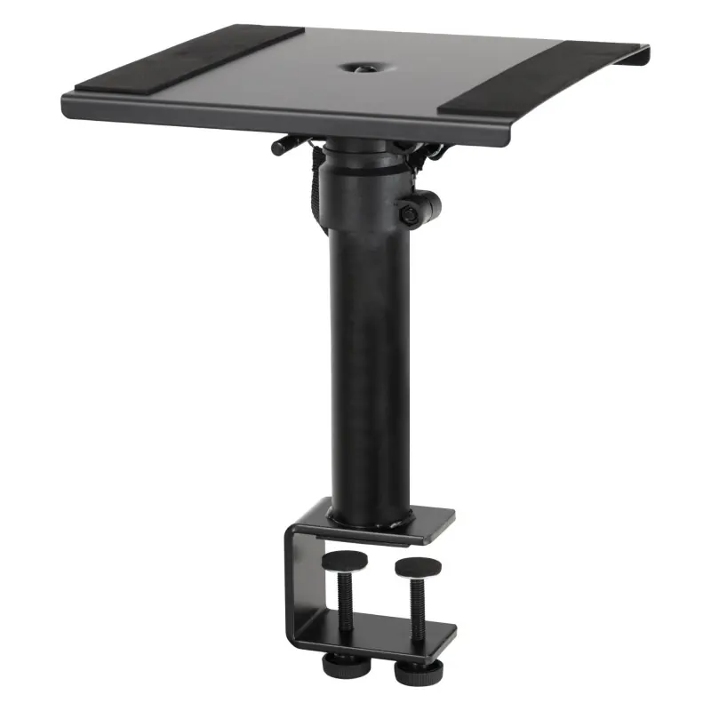 Stolní stojan pro studio nebo DJ monitory v černé barvě se svorkou pro upnutí na desku stolu vyznačující se vysokou stabilitou, Stojan je výškově nastavitelný v rozmezí od 24,5 cm do 41,5 cm a vhodný je pro stolové desky o tloušťce 15 až 50 mm.