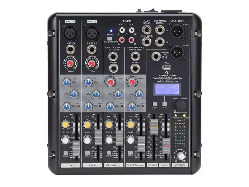 Youmix 202 Media je šestikanálový mixážní pult se dvěma XLR vstupy s mikrofonním preampem, dvěma páry Line vstupů, dvěma XLR výstupy do PA, sluchátkovým výstupem pro detailní monitoring a USB portem pro připojení přehrávače nebo Flash disku. Pult dále disponuje RCA konektory pro připojení hudebních přehrávačů a následné propojení s dalším zařízením. Tuto funkci ocení především DJs a moderátoři na firemních večírcích. Výsledný signál potom můžete upravit dvou až třípásmovým ekvalizérem nebo jedním ze 256 efektů (Room, Hall, Vocal, and Plate reverbs; Delay; Echo; Chorus; Flanger, and Combo). Přehled o vašem nastavení získáte prostřednictvím šestiúrovňového LED ukazatele a podsvíceného displej. Hlasitost potom upravujete pomocí 60mm faderů na každém kanálu.