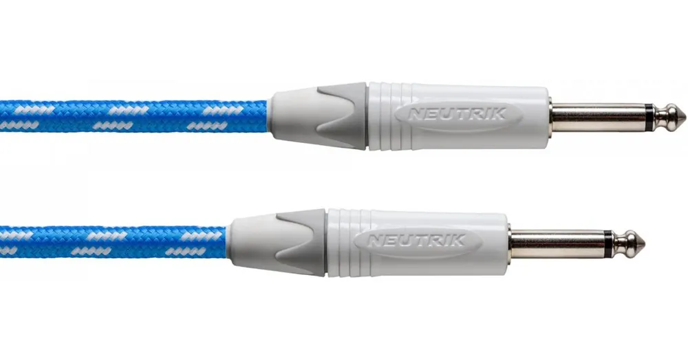 nástrojový kabel, Jack 6.3 mono – Jack 6.3 mono, délka 6 metrů, originální konektory Neutrik, pásek na suchý zip, modrá barva kabelu, bílá barva konektorů
