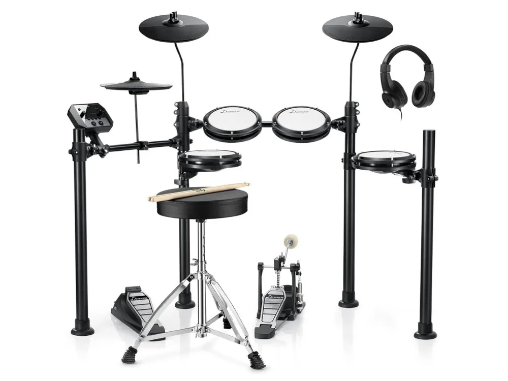 Nezávislý silikonový basový buben zajistil přesný zvuk perkusí. Může přinést úplný a autentický pocit ze hry. Elektrické bicí Donner DED-95 s dvouvrstvou síťovou strukturou o vysoké hustotě, která se blíží skutečnému zážitku z úderů do bubnu. 4 stojany jsou stabilnější než jiné, zaručují dlouhou životnost. Perfektní první bicí souprava pro začátečníky. Vše, co potřebujete k bubnování, včetně bubenické židle, sluchátek, audio kabelů a holí.