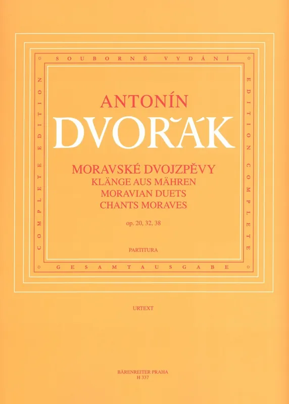 Tento titul Vám nabízí Moravské dvojzpěvy na texty moravských lidových písní s doprovodem klavíru. Písně byly zkomponovány na popud pražského velkoobchodníka Jana Neffa, rodáka z moravského Lipníku nad Bečvou, u něhož byl Dvořák zaměstnán jako domácí učitel hry na klavír.Nejprve vznikla Tři dueta pro soprán a tenor s průvodem piana ( op. 20) a pro velký úspěch u rodiny Neffů složil Dvořák ještě II. a III. cyklus (op. 32), tentokrát určený pro ženské hlasy. Celý soubor písní završuje v roce 1877 dalšími čtyřmi dvojzpěvy s doprovodem klavíru, vydanými jako op. 38.Namísto prosté úpravy lidových melodií vytváří Dvořák na lidové texty dvojzpěvy s hudbou vlastní. Toto dílo významně přispělo k úspěchu a proniknutí Dvořákova díla v cizině. Titul, který se Vám dostává do rukou, je kritickým vydáním (urtextem) podle skladatelova rukopisu.