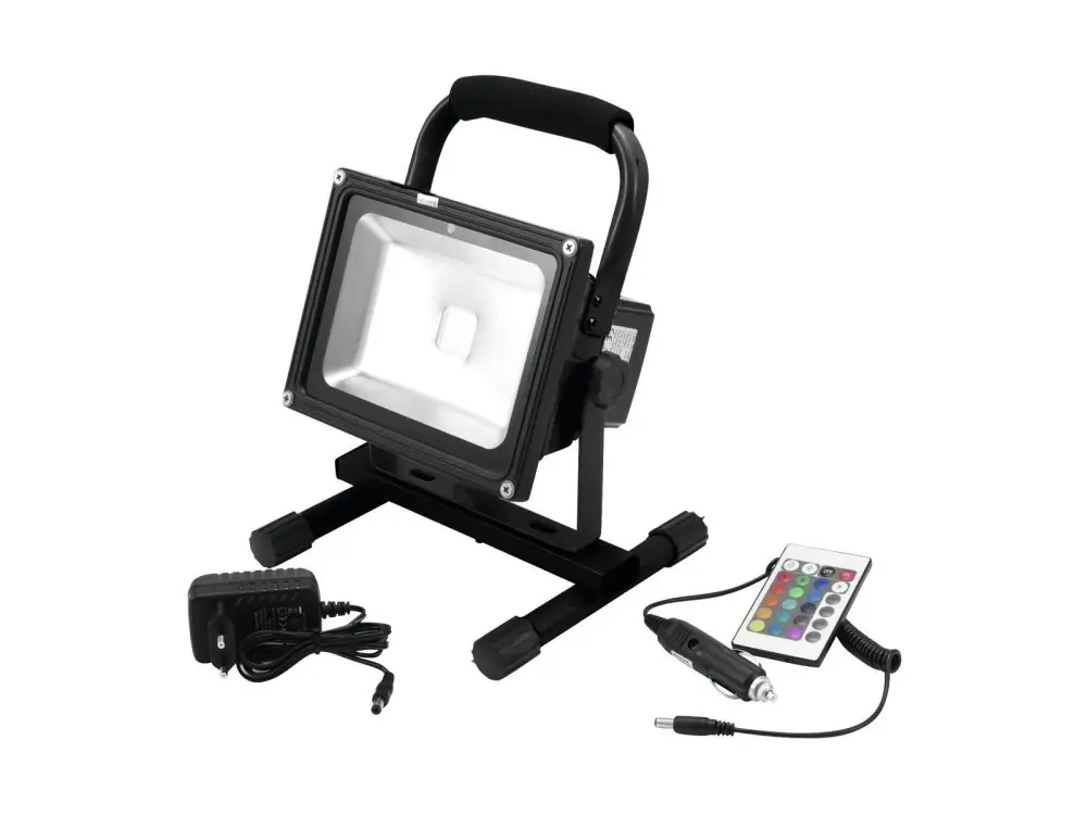 Výkonný venkovní reflektor je osazený 20W COB LED a vybavený dobíjecí baterií na 3 hodiny samostatného provozu. Možnost napájení světelného efektu ze sítě nebo automobilu (adaptery jsou součástí dodávky). Reflektor je vhodný pro použití v exteriéru (třída krytí IP 64). Vyzařovací úhel 63, RGB míchání barev, korekce jasu a zabudované provozní režimy. Reflektor je vybaven IR dálkovým ovladačem pro nastavení a ovládání provozních režimů. Robustní provedení, nastavení požadovaného úhlu svícení pomocí fixačních šroubů. Možnost postavení i zavěšení světelného efektu, přenosný stojan a pogumované madlo pro snadnou instalaci a manipulaci.