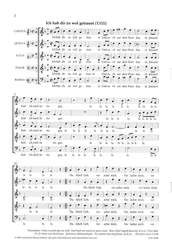 Šest písní ze zpěvníku The Lustgarten neuer teutscher Gesang, Balletti, Galliarden und Intraden, který v roce 1601 napsal německý hudební skladatel Hans Leo Hassler. Písně jsou v aranžmá pro pětihlasý vokální soubor SATB nebo kvintet melodických nástrojů. Pro instrumentální provedení skladeb je možné hudební soubor vytvořit z následujících hudebních nástrojů – zobcové flétny, příčné flétny, housle, violy, violoncella, kornety, trombony a další nástroje …
