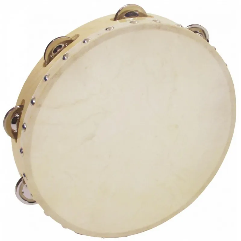Tamburína s blánou, průměr 25,4 cm (10″). 8 párů plíšků. Přírodní kůže přibitá na dřevěném rámu.