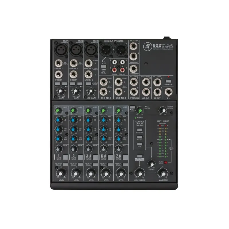 Konkrétně 802-VLZ4 je kompaktní 8 kanálový mixpult, který nabízí 8 linkových vstupů a 3 mikrofonní vstupy, kdy u mikrofonních jsou použity kvalitní předzesilovače Onyx, které můžete znát z nejvyšších řad Mackie. Ty nabízí až 60 dB rozsah gainu, díky čemuž je možné v dynamickém rozsahu dostat až na 128,5 dB. Zajišťují to nejvěrnější zesilení signálu na všech frekvencích a minimální úroveň zkreslení. Samozřejmě nabízí i phantomové napájení při použití kondenzátorových mikrofonů.