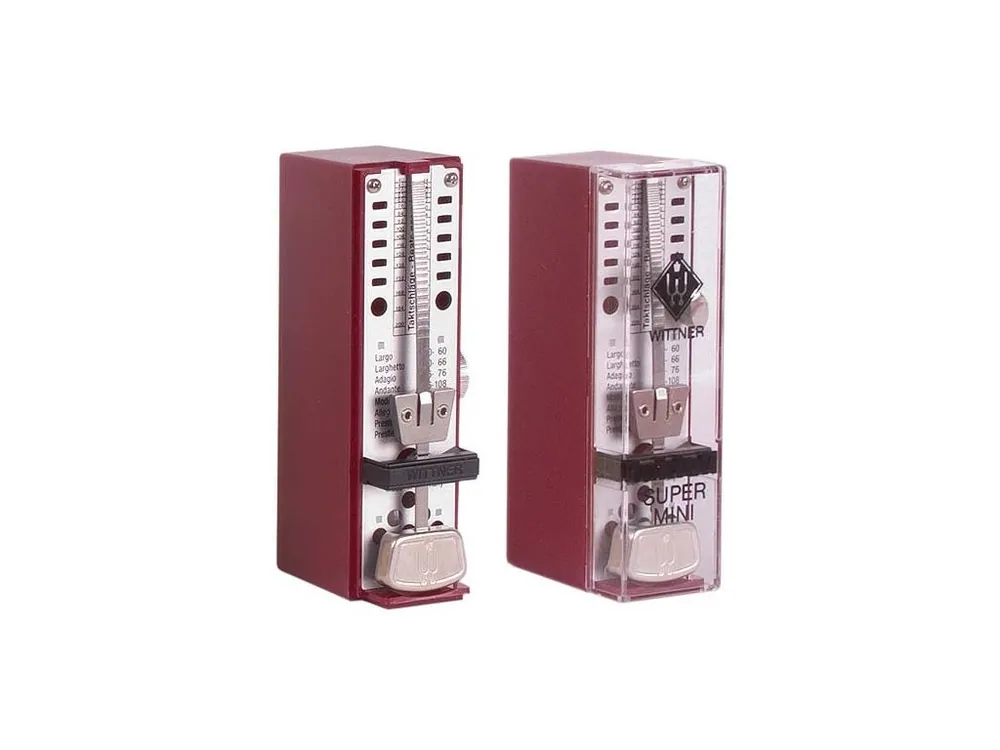 Mechanický metronom Super Mini, série Taktell od firmy Wittner, plastové tělo, hodinový strojek, kapesní provedení – 105 x 30 x 50 mm, barva: červená (ruby).