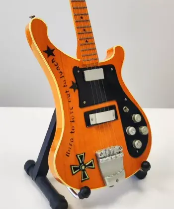 Exkluzivní miniatura kytary, vyrobená ze dřeva se všemi detaily nástroje. Krásné ruční detailní zpracování. Délka kytary cca 25 cm, šířka 7 – 9 cm. Včetně stojánku. V dárkové krabičce. Skvělý dárek na ozdobu pokoje nebo pracovního stolu pro zapáleného kytaristu. Model Lemmy Kilmister Motörhead Rickenbacker 4000 Born To Lose, Out To Lunch Bass.