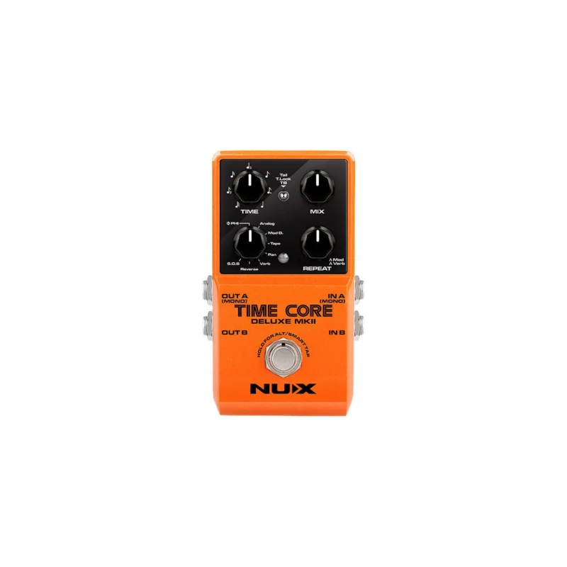 Time Core Deluxe MKII je stereo kytarový efekt – delay od výrobce NUX. Jedná se o druhou generaci oblíbeného efektu, který nabízí 7 různých druhů delaye (Phi Digital Delay, Analog Delay, Modulation Delay, Tape Echo, Pan Delay, Verb Delay a Reverse Delay). K dispozici se dále nabízí looper o maximální délce smyčky 40 sekund. Pro snadnou synchronizaci tempa potěší funkce Tap tempo. Stereo konektory umožňují flexibilní zapojení pedálu do signálového řetězce. Efekt dovoluje vybrat ze tří typů bypass zapojení (True, Buffered a Trail).