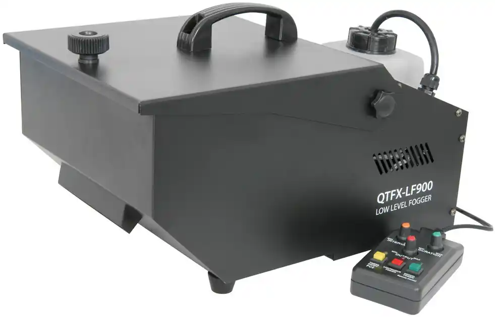 900W výrobník plazivé umělé mlhy. Díky nádobě s ledem má mlha vyšší hustotu a drží se u země. Dodáváno včetně kabelového dálkového ovládání s časovačem. // Originální popis produktu (EN): A compact 900W low-level fog machine which uses fog fluid running over a tray of ice to produce a heavy low level fog that creeps along the floor. The perfect tool to create an atmosphere in theatres, on a stage, in a film or a display at exhibitions. You can control the output and the time delay from the provided hand held controller. We recommend QTX low level fog fluid (SA160592, SA160593) for use with this machine. Full ice reservoir lasts 3 hours (12 hours standby). Easy to drain ice compartment. Supplied with timer remote control. 4000 Cu Ft (113m) / min. Fluid level sensor.