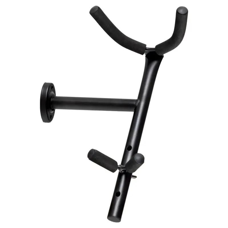 Stojan pro alt a tenor saxofon určený k montáži na zeď v černém provedení se spodní podpěrou nastavitelnou do 3 poloh a polstrováním pro ochranu nástroje. Velmi praktické řešení, které eliminuje nebezpečí poškození nástroje, které může hrozit u stojanů umístěných na zemi.