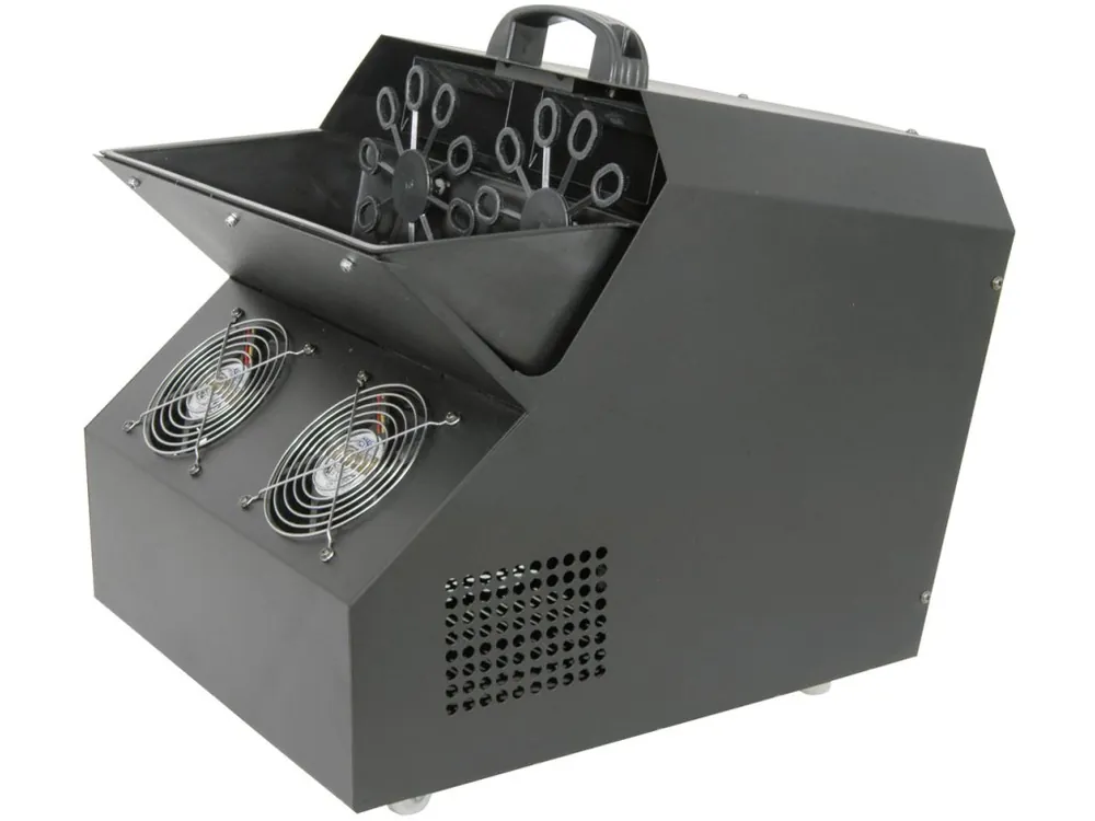 Výkonný párty bublifuk vybavený dvěma koly otáčející se rychlostí60 ot./min a čtyřemi výstupními ventilátory (dva vzadu a dva vpředu) pro výrobu velké množství bublin a optimálního proudění vzduchu. Dodáváno včetně dálkového IR ovladače.