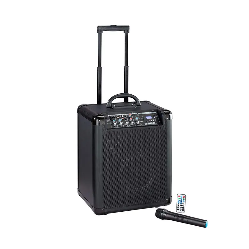 Pojízdný ozvučovací systém Blackport nabízí bohatou výbavu pro každého pouličního umělce nebo muzikanta na cestách. Příjemný výkon 80 W doplňuje čtyřkanálový mixér se samostatnými ovládači hlasitosti, reverbem a dvoupásmovým ekvalizérem. Připojit můžete prakticky cokoliv – nástroj, mikrofon či jiný externí audio zdroj, a to i prostřednictvím Bluetooth. Součástí výbavy je dále bezdrátový mikrofon, integrovaný digitální přehrávač s dálkovým ovladačem a sloty pro SD karty a USB. Dobíjecí baterie s indikací stavu vydrží v provozu až 6 hodin. Robustní konstrukci na kolečkách doplňuje praktická teleskopická rukojeť.