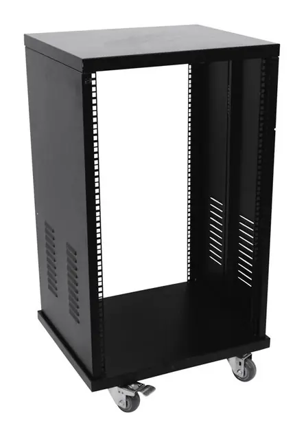 Ocelová racková skříň (bez dveří) s děrovanými kolejnicemi vpředu a vzadu a čtyřmi otočnými kolečky se dvěma aretačními brzdami. Integrovaná nosná lišta v bočních panelech pro těžká zařízení (např. výkonové zesilovače). Instalační hloubka 41 cm, instalační výška 16U. Maximální zatížení 100 kg. Dodáváno v rozloženém stavu. Barva černá.