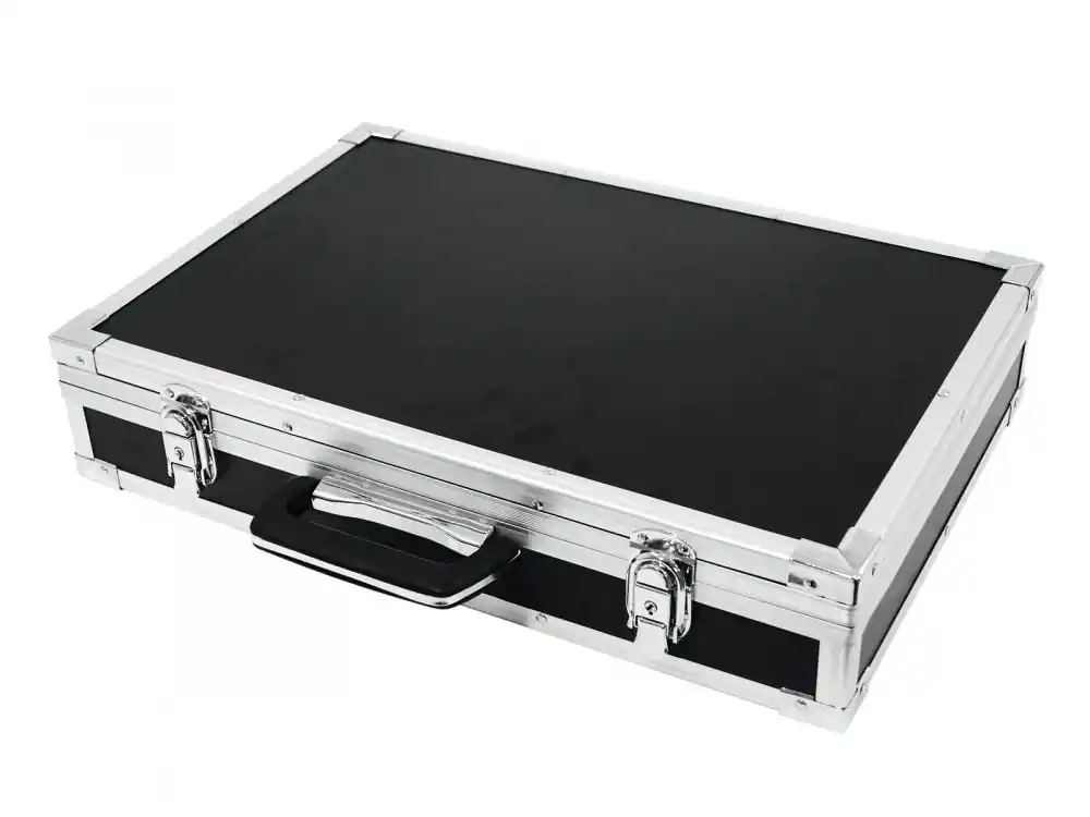 Transportní kufřík pro 6 podlahových kytarových efektů. Ochranné hliníkové lišty, 1.5 mm překližka, chromové zámky. Rozměry 440 x 300 x 70 mm.
