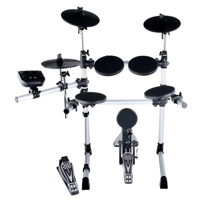 Se 4 bicími pady, 3 činelovými pady, kick padem, stejně jako nožním pedálem a hi-hat, je sada dodávána v osvědčené standardní verzi, a proto je ideálně vybavena pro začátečníky.