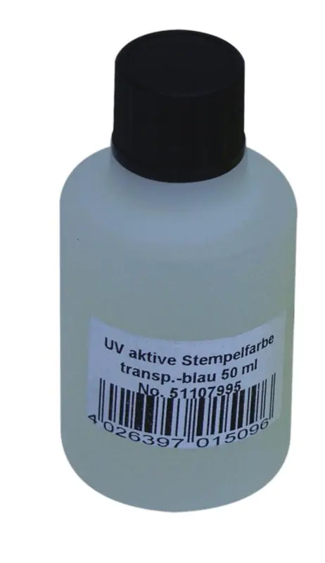 UV aktivní razítkovací barva, transparentní modrá, 50 ml. Vhodná pro označení návštěvníků u vstupu diskoték, tanečních klubů a jiných společenských akcí. Viditelná pouze pod UV světlem. Vyrobeno v Německu.