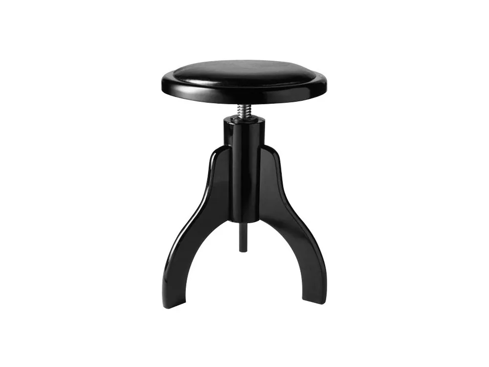 Stolička ke klavíru kulatá, vytáčecí 45 – 55 cm, průměr sedáku 35 cm, čalounění 30 cm, nosnost 100 kg, hmotnost 5 kg. Barva černá lesklá, sedák černý vinyl.