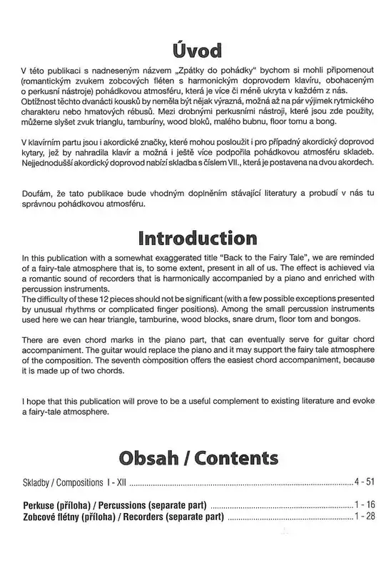 „V této publikaci s nadneseným názvem „Zpátky do pohádky“ bychom si mohli připomenout pohádkovou atmosféru, která je více či méně ukryta v každém z nás. Obtížnost těchto dvanácti kousků by neměla být nějak výrazná, možná až na pár výjimek rytmického charakteru nebo hmatových rébusů. Mezi drobnými perkusními nástroji, které jsou zde použity, můžeme slyšet zvuk trianglu, tamburíny, wood bloků, malého bubnu, floor tomu a bong.